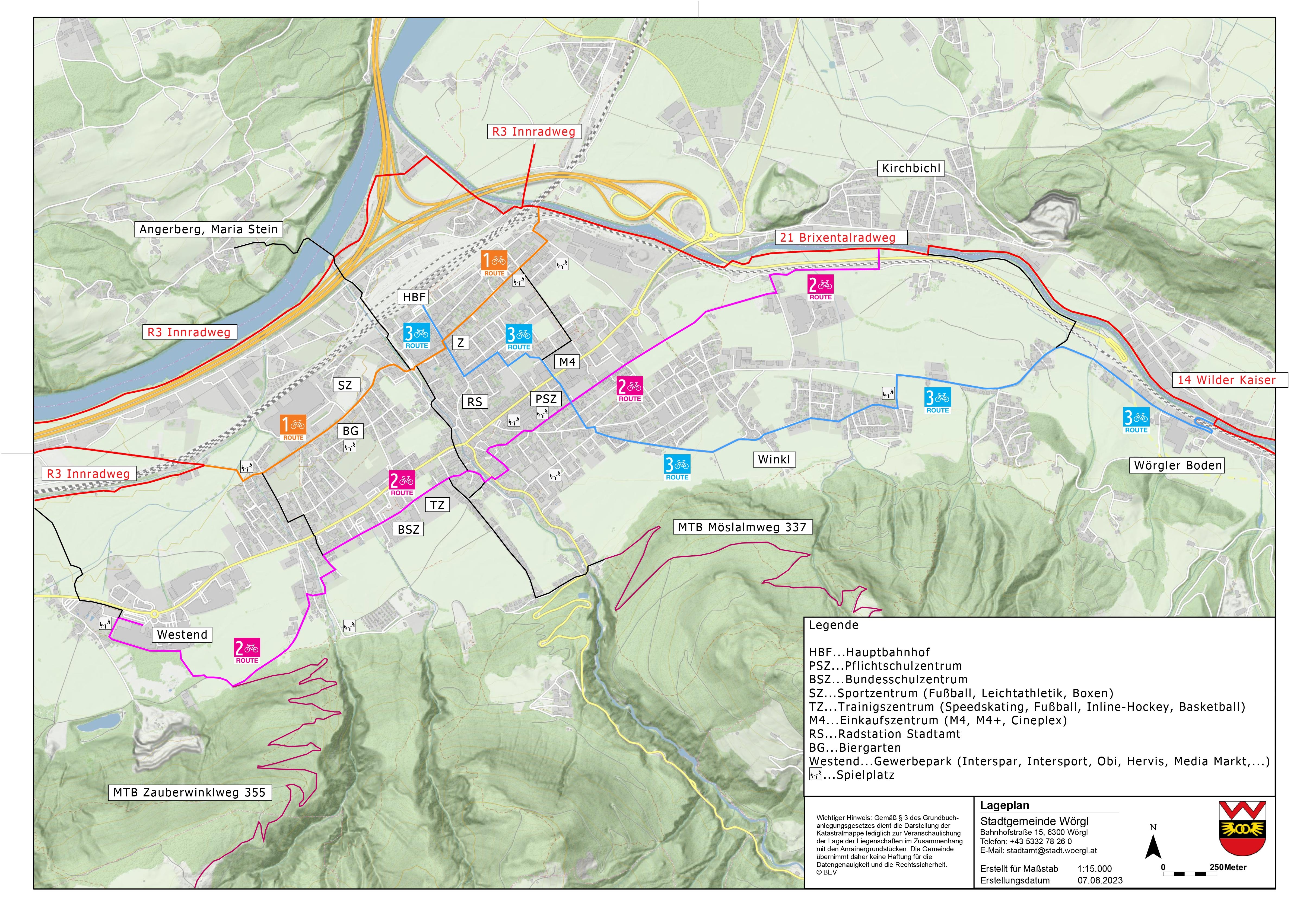 Nachdem die Planung zum Radwegenetz in Wörgl im Winter abgeschlossen werden konnte, wurde im Mai vom Stadtbauhof Wörgl die Radwegbeschilderung an den vorgegebenen Routen angebracht. Die Routen sind am Lageplan „Radwegenetz Wörgl“ ersichtlich. Hier noch eine kurze Erklärung zu den Routen.
